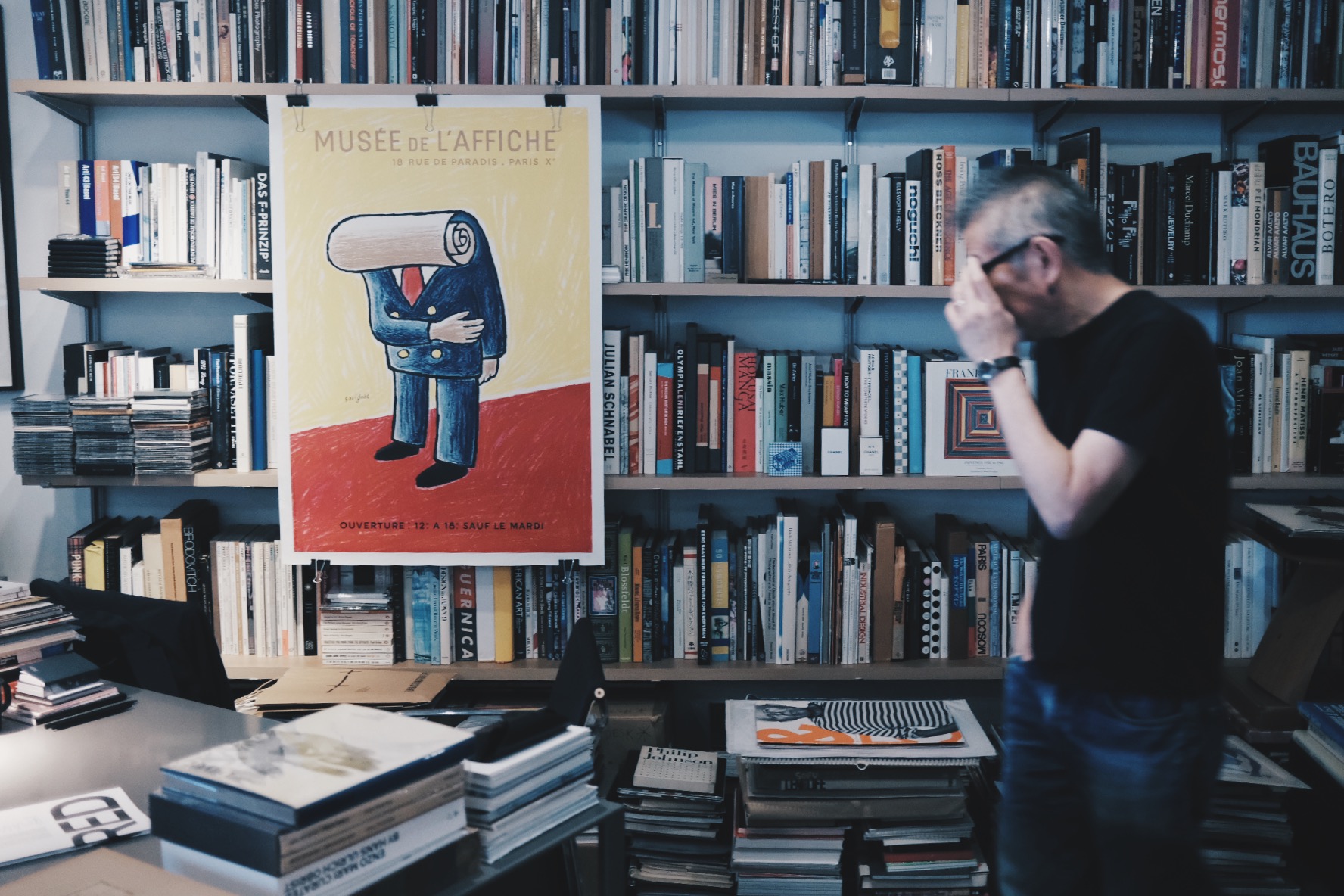 Walking into his studio, one can see an assortment of items. Among the expected piles of books, magazines, vinyls, and posters, there are also many personal belongings, each with its own story.