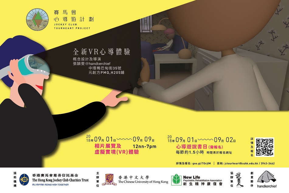 為咗向大眾推廣精神健康同埋反歧視嘅重要,《賽馬會心導遊計劃》將會喺9月1至9日舉辦「心導體驗 – 我們的經歷」公眾展覽,內容包括心導遊說書日、相片展覽、虛擬實境 (VR) 體驗,我哋希望用唔同形式嘅活動,讓大眾親身體驗同埋感受有精神病經歷嘅人嘅經歷,從而增加認識,減少誤解。