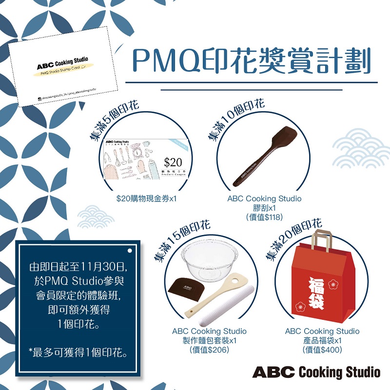 由5月1日至11月30日親臨PMQ Studio 完成指定條件,亦可以參與印花獎賞計劃!儲齊指定印花就可以換禮物!我們將不定期公開更多獲得印花的條件,請務必追蹤PMQ studio、ABC Cooking Studio Hong Kong 的 Instagram以獲取最新資訊。