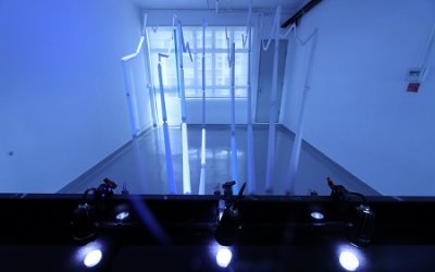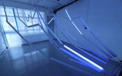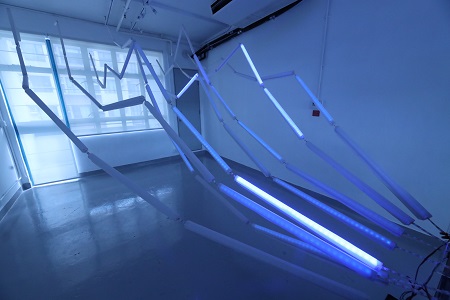 「愈吹愈大」是一个互动光影装置,取「吹水」的字面意思,配合感应器和程式设计,转化使用者「吹水」的力量,掀起一浪接一浪的光束舞动,让吹水化作巨浪。
