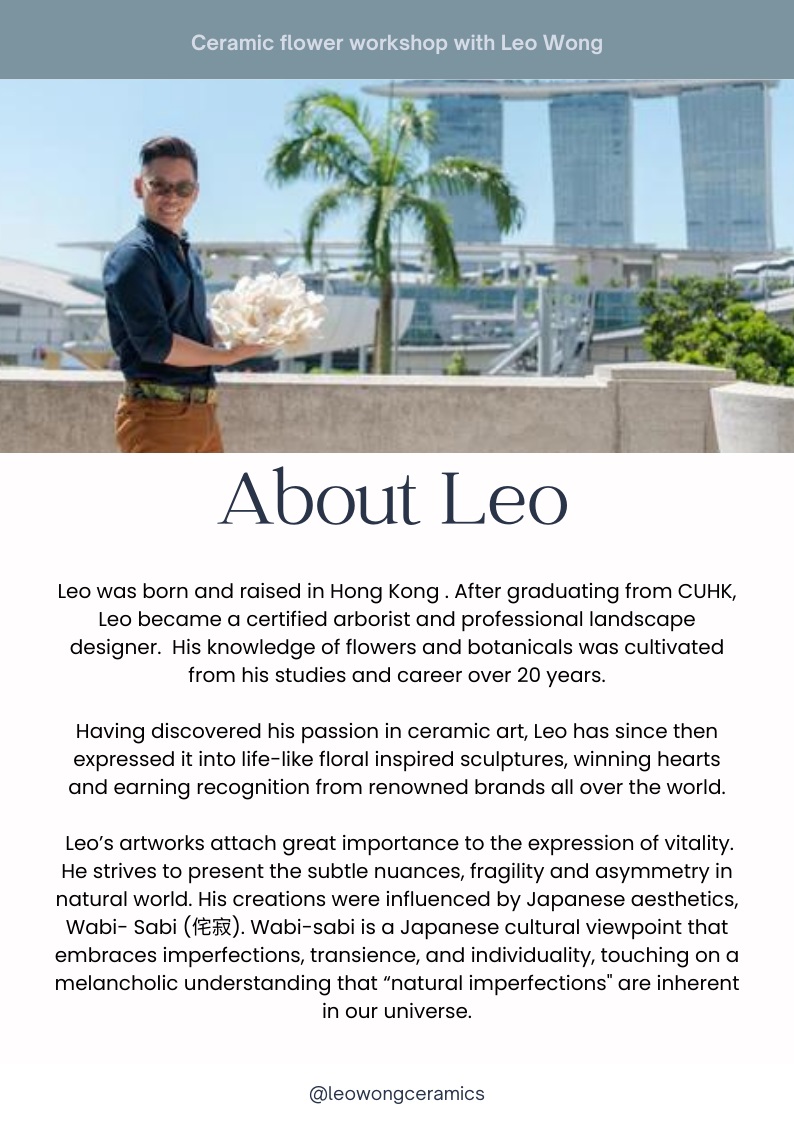 Come join us for a fun and creative workshop with renowned artist Leo Wong at PMQ – Staunton! In this hands-on session, you’ll learn how to create stunning botanical plates using various techniques and materials. Whether you’re a beginner or an experienced artist, this workshop is perfect for anyone looking to unleash their creativity and learn something new. Don’t miss out on this unique opportunity to learn from a talented artist and create your own beautiful botanical masterpiece!