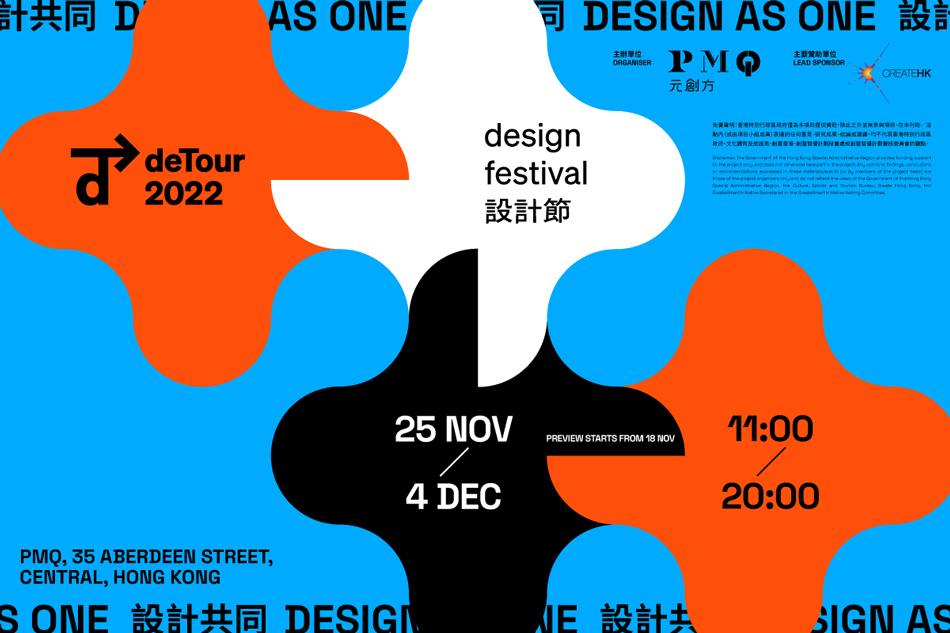 deTour 作為香港最大型的設計節,自 2004 年起一直透過別開生面的設計活動,連結公眾和設計界、本地與國際設計社群。今年 deTour 2022 以「設計共同」為主題,在 11 月 25 日至 12 月 4 日期間,由利志榮、陳韻淇和 STICKYLINE 組成的策展團隊,將 PMQ 元創方變身成為公眾參與設計的趣味實驗場,讓公眾親身在實體展場和虛擬設計節,共同參與不同形式的設計意念和活動,探索生命、環境、消費、社區、食物等關係你我的主題。