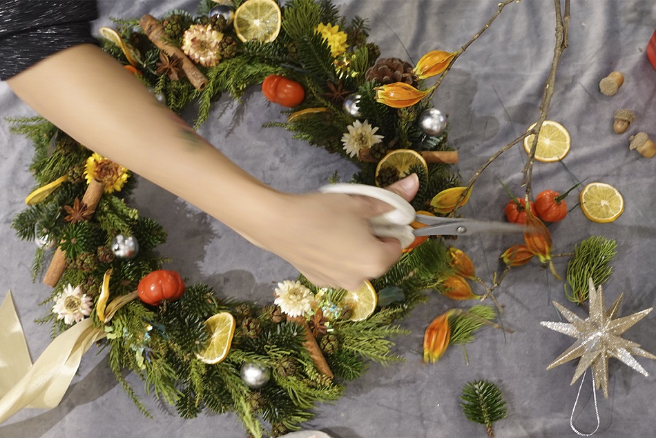 DIY圣诞香松圈,最少三种不同松柏类材类,创造独一无二的作品。哗花池提供更多新鲜有趣材料例如茄子,干橙片,以至传绝闪闪波来装饰,专心一致,享受ME time,分享你的作品给自己及朋友!
