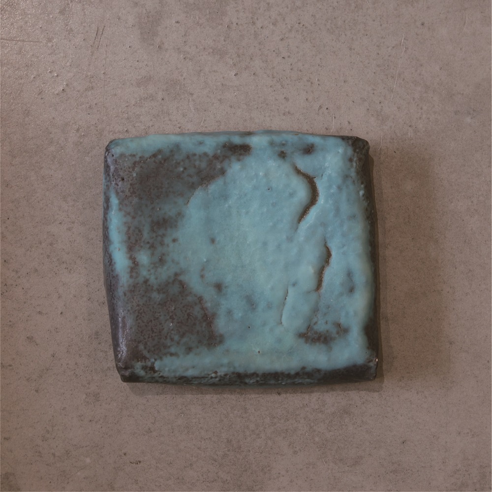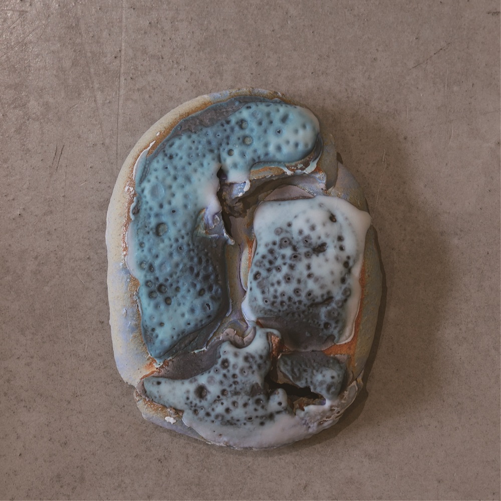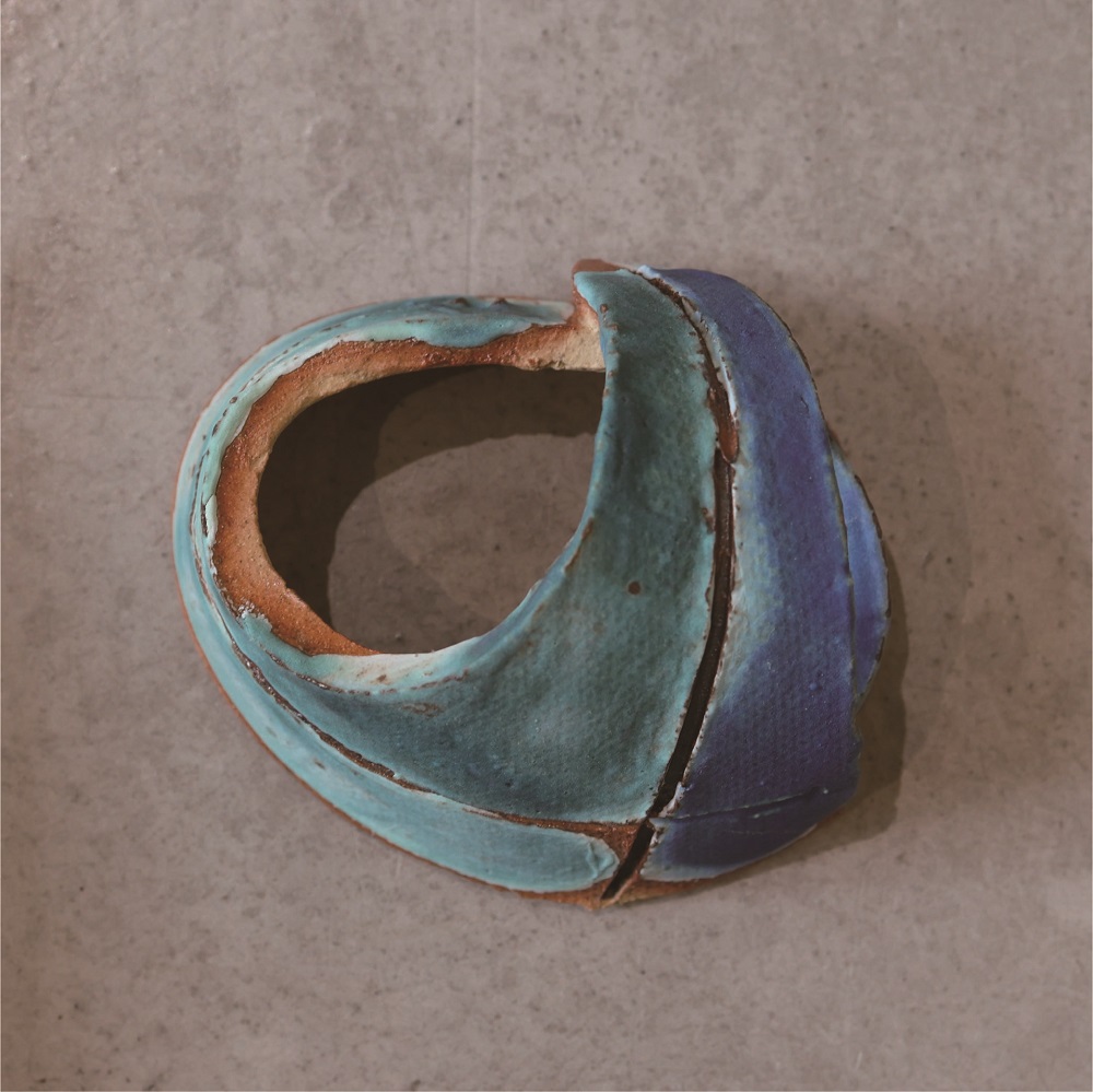 在【擁抱無限的藍】的系列作品中,色彩凝聚了她對大自然神聖的回饋。靛藍色的釉藥與場域互相輝映,飄如游雲的動態在重疊中滲出變化。流動的觸印和微粒感像穿梭時空中,卻偶然停留在此處,成為了交織穿梭時空的印記。