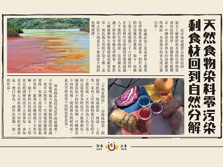 天然剩食染色,剩馀食材来自香港本地食品生产商或供应商,所有素材收集后均会经过分类再消毒处理。