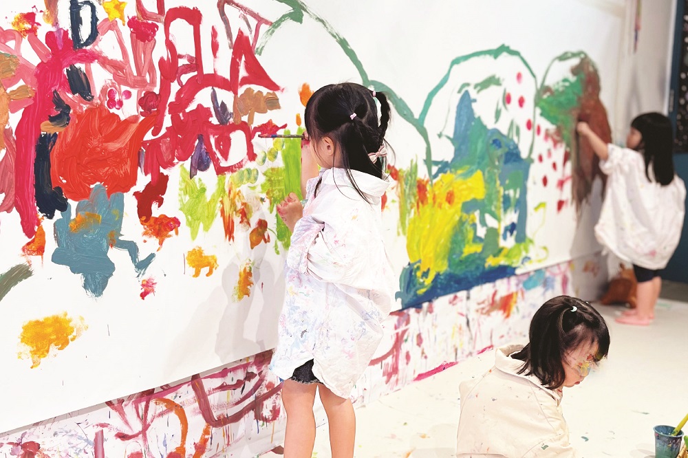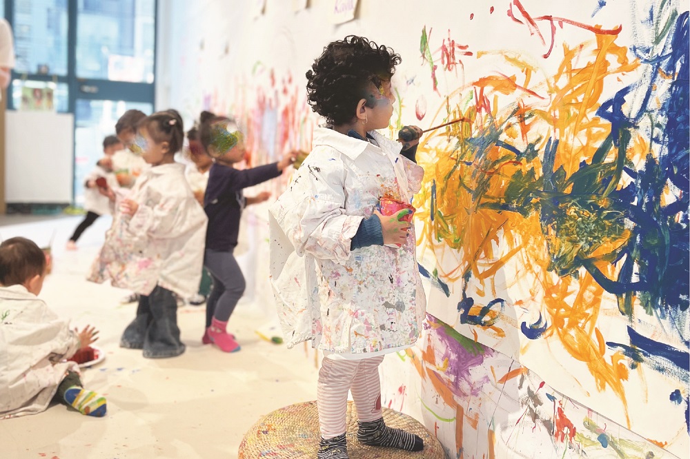 • Once the Christmas trees are completed, kids can let their creativity run wild with free flow wall painting. This is a highlight of our workshop and a big hit with parents and children alike!