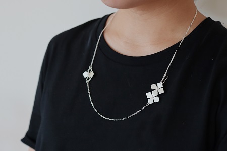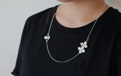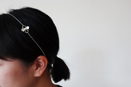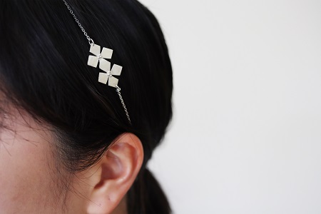 以几何图案模仿大自然的植物,透过金工基本的锯切、焊接及打磨技巧,以简单的技巧制作成头饰/颈链两用的饰品,易于配衬日常不同的打扮风格。