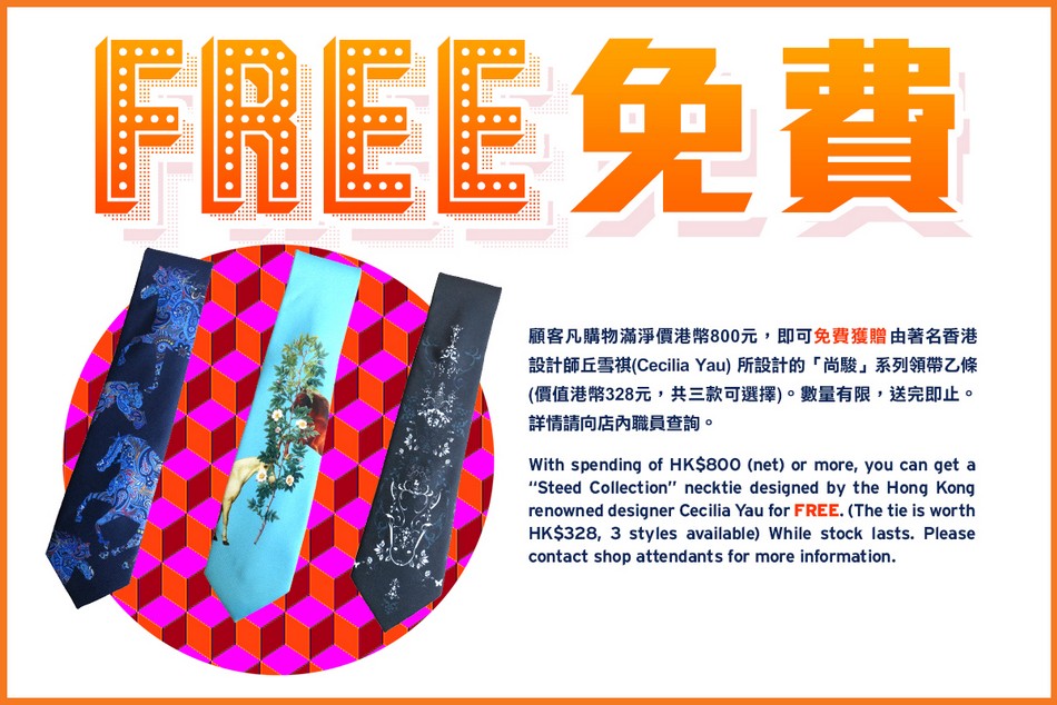 顾客凡于香港设计廊购物满净价港币800元,即可免费获赠由著名香港设计师丘雪祺(Cecilia Yau) 所设计的「尚骏」系列领带乙条(价值港币328元,共三款可选择) 。数量有限,送完即止。