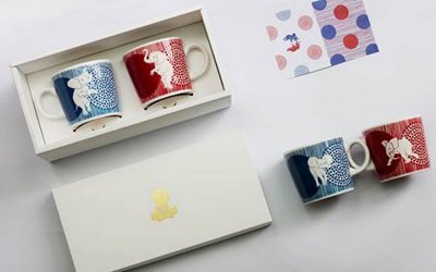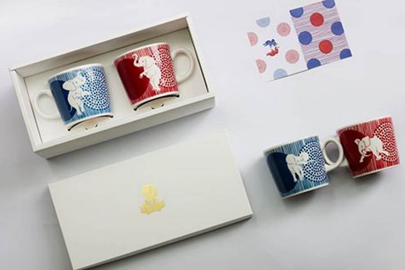 这是一对分别印有手绘男性大象和女性大象的杯子。当把杯子靠近, 它们的鼻子会形成一个爱心图案。