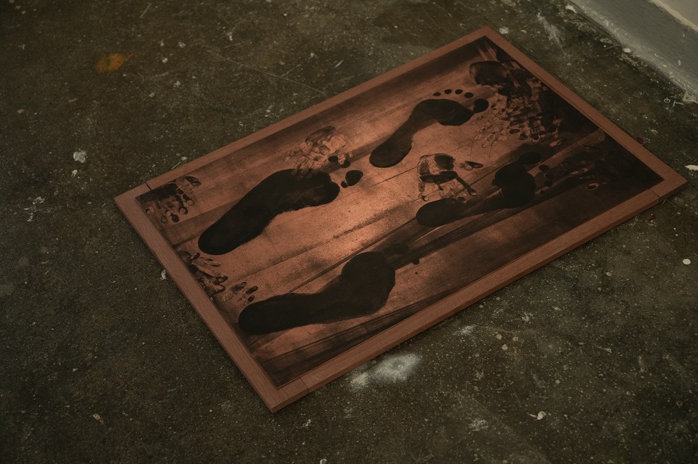 The plates, placed at the centre of the room, stand as raw, permanent witnesses to a fleeting bodily memory. Meanwhile, the resulting edition prints reveal the subtleties embedded in every crevice of the skin—whether it be the palms, eyes, shoulders, lips or torsos. By juxtaposing the plates with the prints, this series of work underscores the interplay between tangible physicality and the subdued emotional impressions that give us the strength to live on.