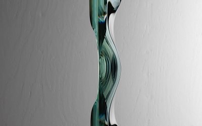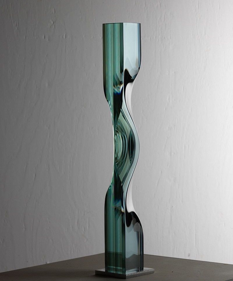 Japanese sculptor Toshio Iezumi’s (b. 1954) glass sculptures are always filled with movement. Humble sheets of flat plate glass are fused together, then using techniques honed and perfected over an almost 40-year career, he patiently grinds down and polishes the glass to create unique one of a kind sculptures that appear to be in perpetual motion, interacting with light sources around them.