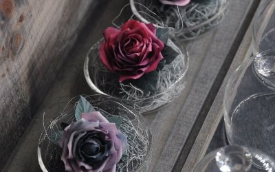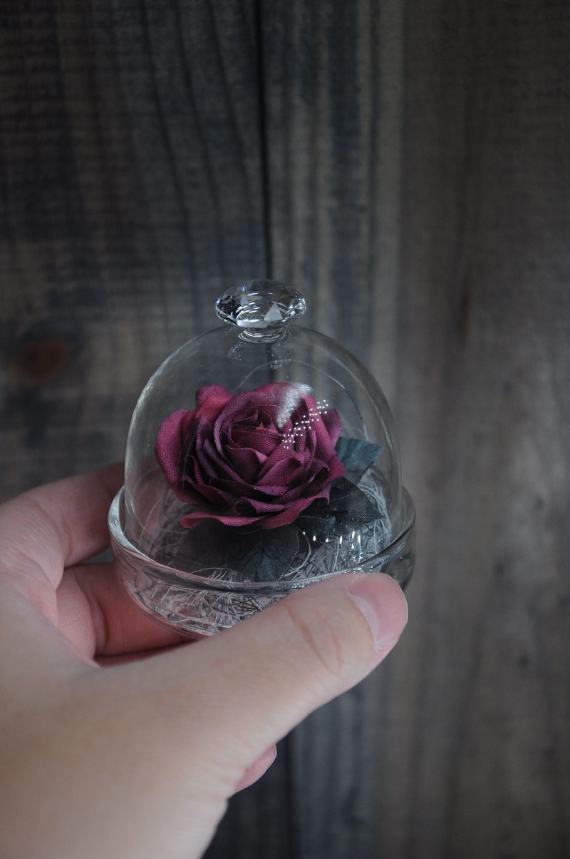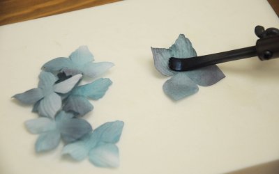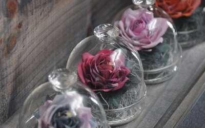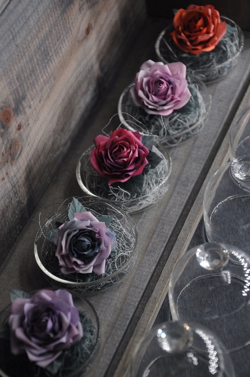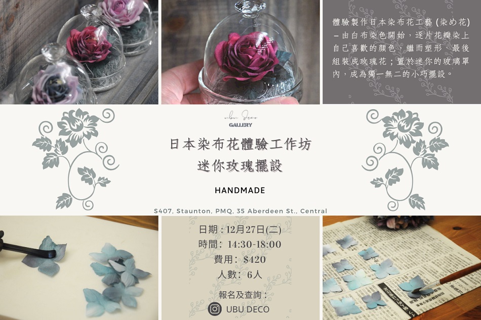 工作坊内容: 体验制作日本染布花工艺 (染め花)-由白布染色开始,逐片花瓣染上自己喜欢的颜色,继而塑形、最后组装成玫瑰花;置于迷你的玻璃罩内,成为独一无二的小巧摆设。