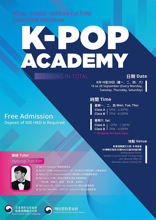 韩流近年风靡全港,为了让大众更深入了解韩国流行音乐K-POP,驻香港韩国文化院与海外文化弘报院特意邀请韩国专业声乐教练来港,亲自为参加者进行声乐训练。参加者将接受两週密集式课程,内容包括声乐训练、韩文歌词学习、录音等,让他们于短期内亦能充分认识韩国的音乐文化。