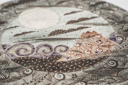 苎坂恒治的作品绘有複杂细緻的图桉,富有强烈而独特的个人色彩。因此,无论他的作品身处何地,你也定能马上辩认出他就是背后的创作者,令人不能不珍而重之。