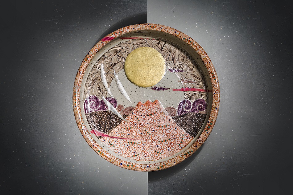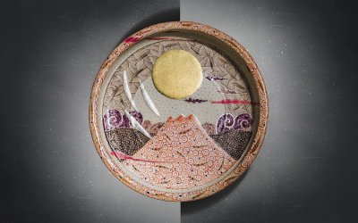 Usaka is famous for his ‘Akae’ fine red illustrations and the organic structures in his works. Most notable in his works are the striking Mt. Fuji patterns which have also been selected by the British Museum to be sold in tangent with their coming Hokusai Exhibition.