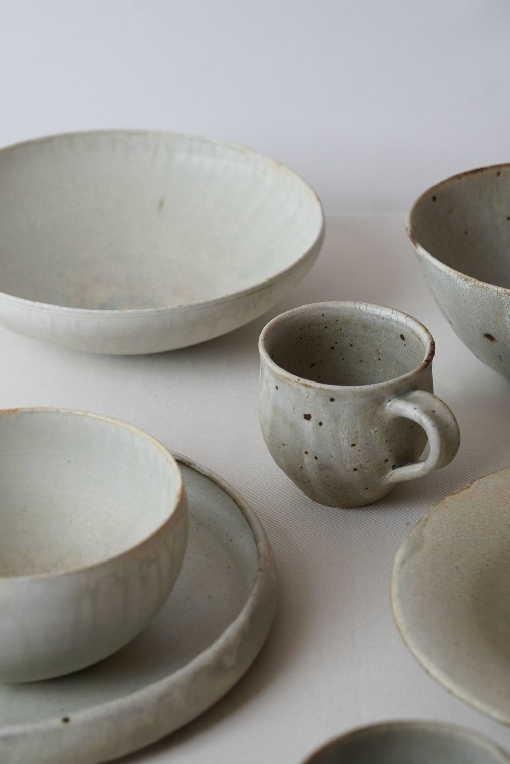 Shimomura aims to blur the boundaries between “objects and people, space,” allowing everything to connect gently. The gradients of white and elegant forms leave a lasting impression. When dishes are served and arranged on the table, these ceramics resonate with each other, creating a harmonious atmosphere in the space.It is for this reason that we have named the exhibition “Life on the Table.”