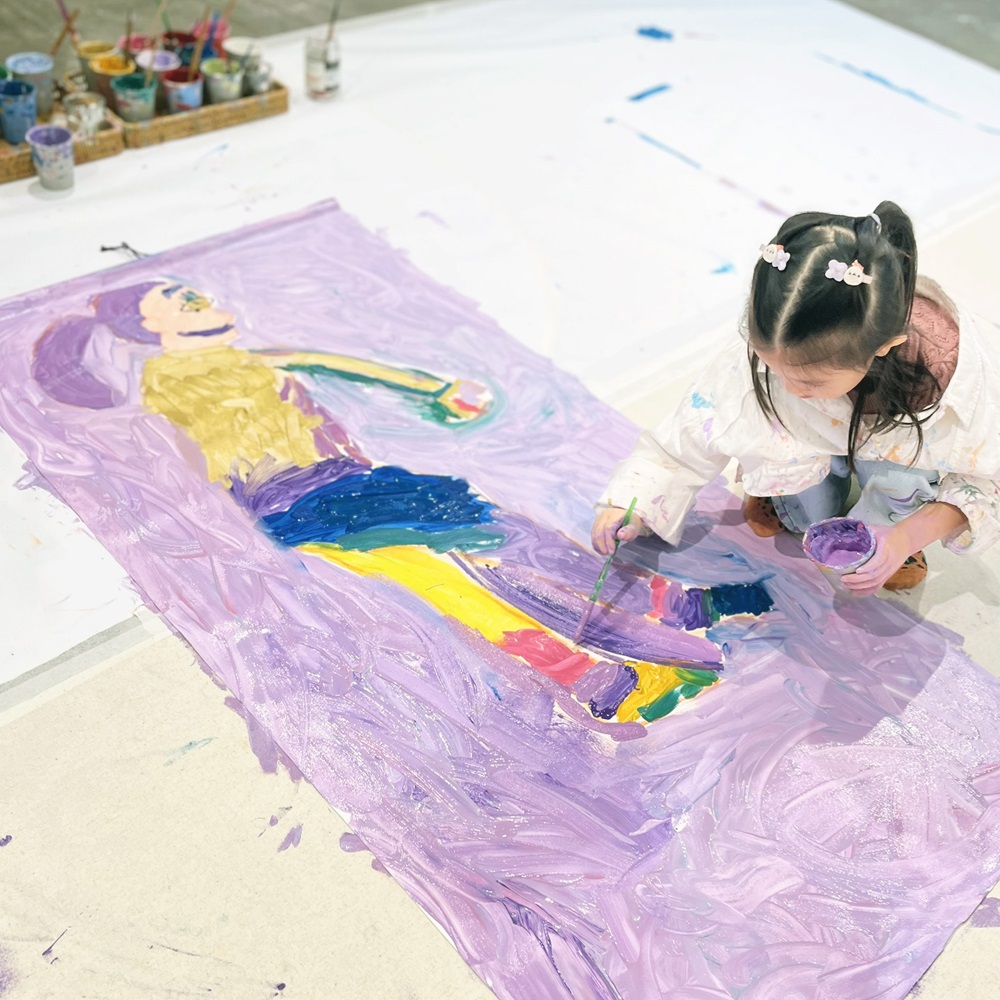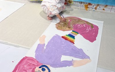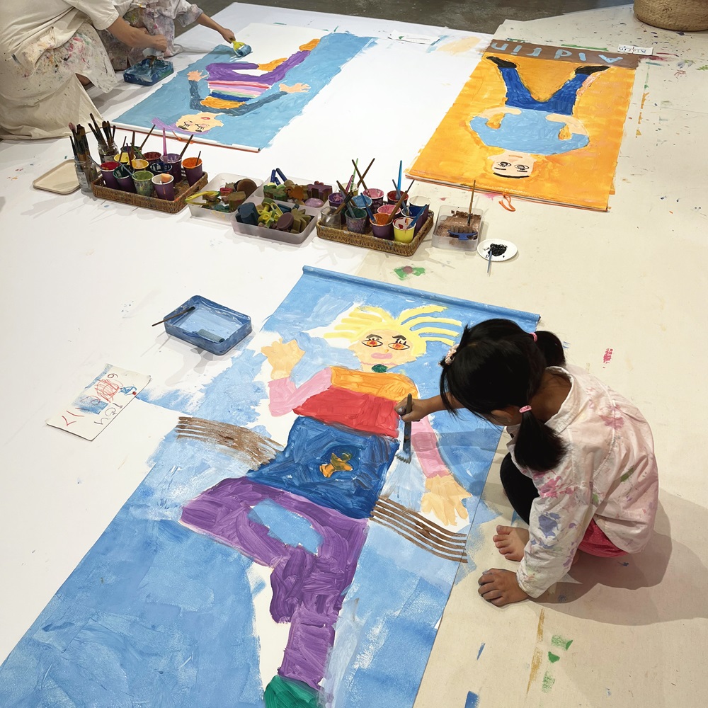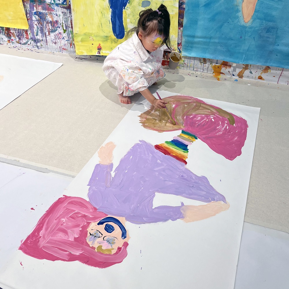 It starts with a story time to inspire funny hairstyling, playful outfits, and unexpected backgrounds. Then, everyone strikes a pose laying on the canvas as we trace their outlines. Children begin their paintings from facial features, creating special colours for eyes, eyelashes, followed by imaginative hairstyles and clothes – fully self-directed.