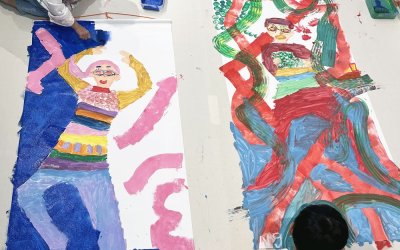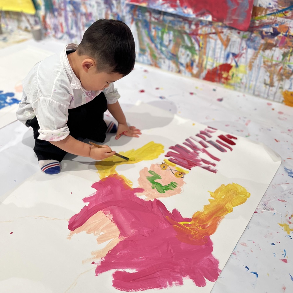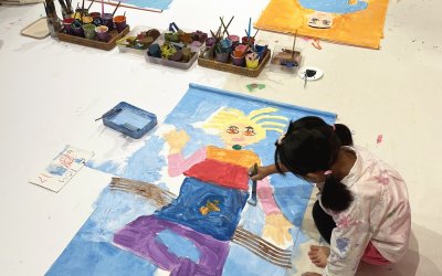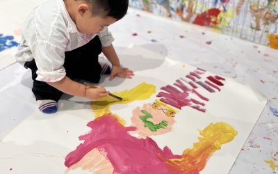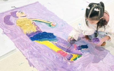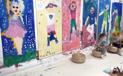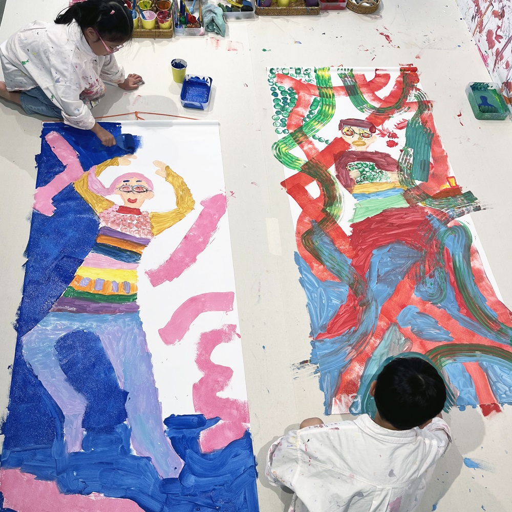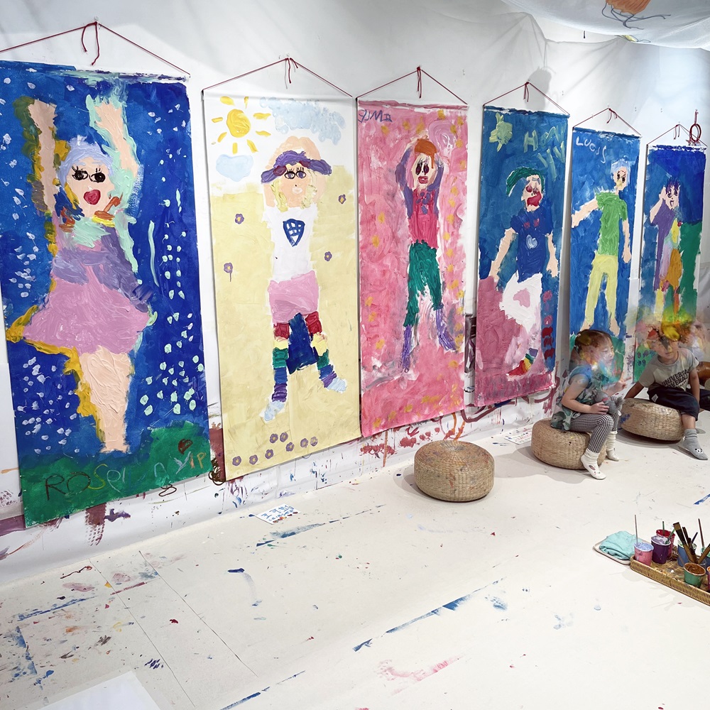 It starts with a story time to inspire funny hairstyling, playful outfits, and unexpected backgrounds. Then, everyone strikes a pose laying on the canvas as we trace their outlines. Children begin their paintings from facial features, creating special colours for eyes, eyelashes, followed by imaginative hairstyles and clothes – fully self-directed.