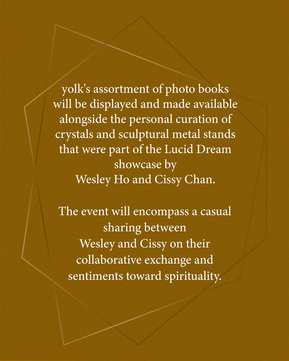 yolk’s assortment of photo books will be displayed and made available alongside the personal curation of crystals and sculptural metal stands that were part of the Lucid Dream showcase by Wesley Ho and Cissy Chan.