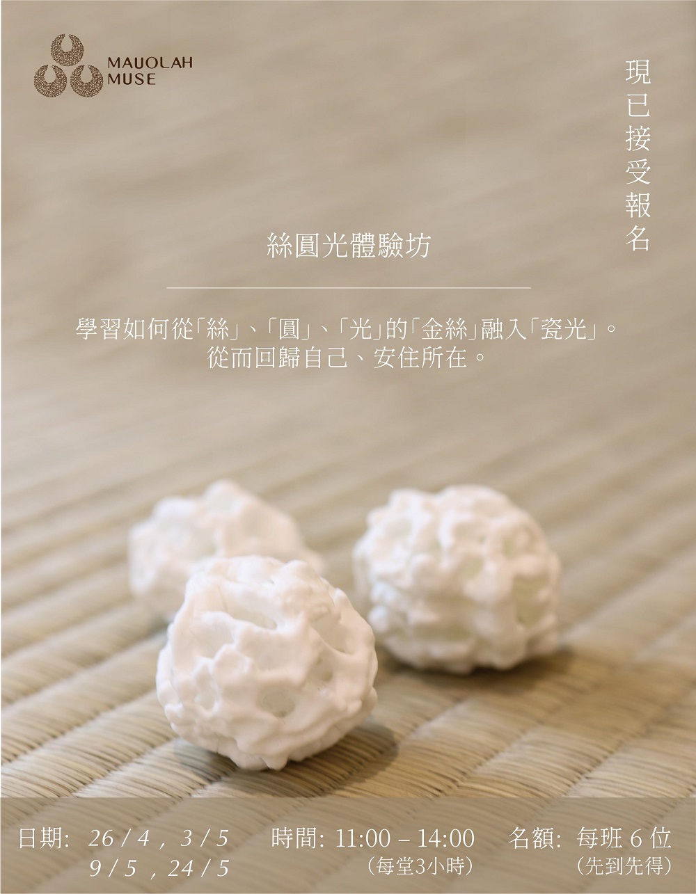 11:00am – 2:00pm(每節 3 小時, 每班限 6 位)