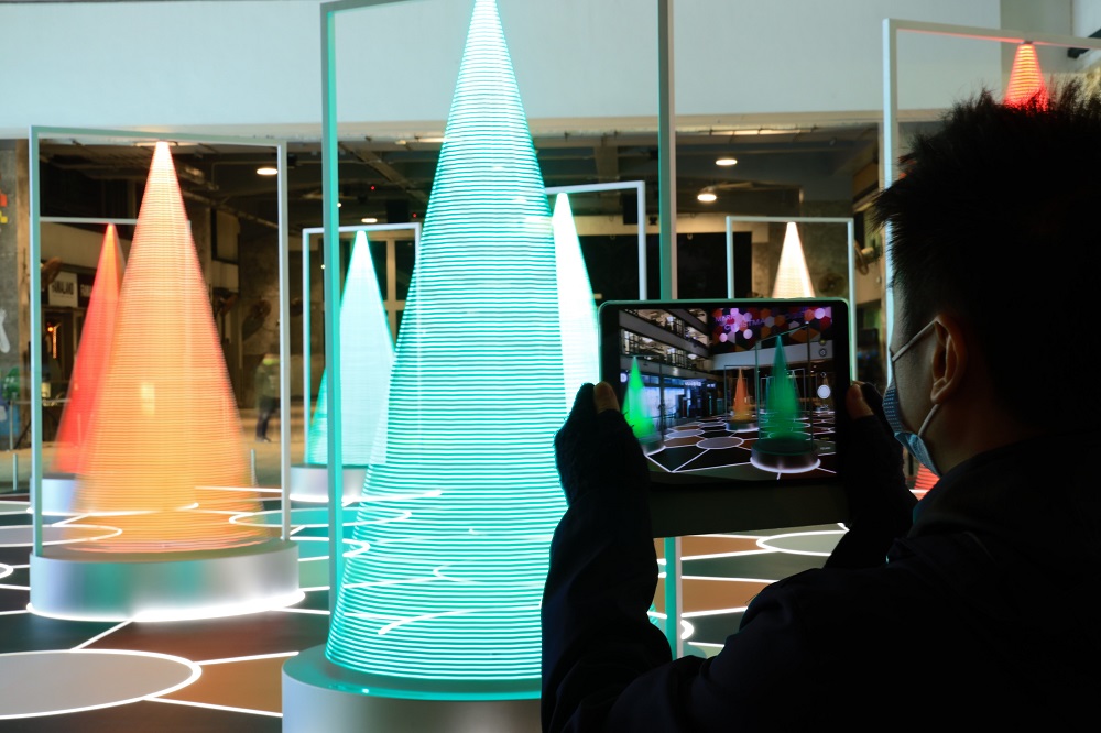旋轉的聖誕樹分佈在幾何圖案上,彼此有著固定間隔,寓意著我們習以為常的安全距離。 樹身的平面幾何圖案跟地板的圖案互相呼應,旋轉時產生立體的視覺效果更構成4D體驗。