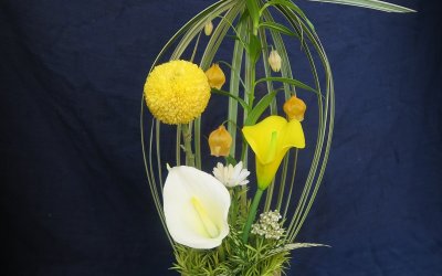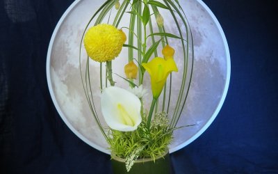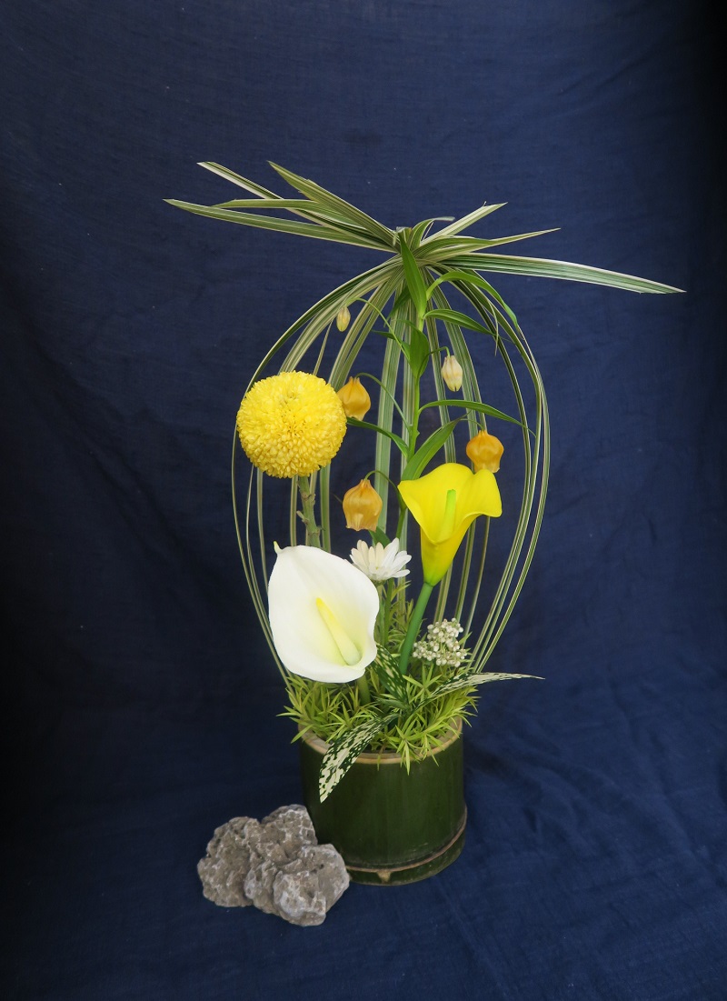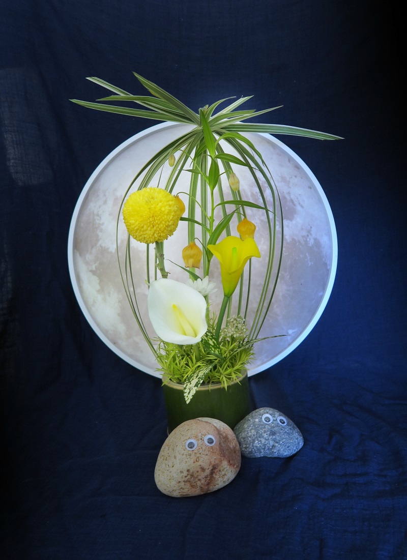 中秋主題花藝創作,用花葉草於竹筒上做出像燈籠的的作品,以花為月,以花為光!
