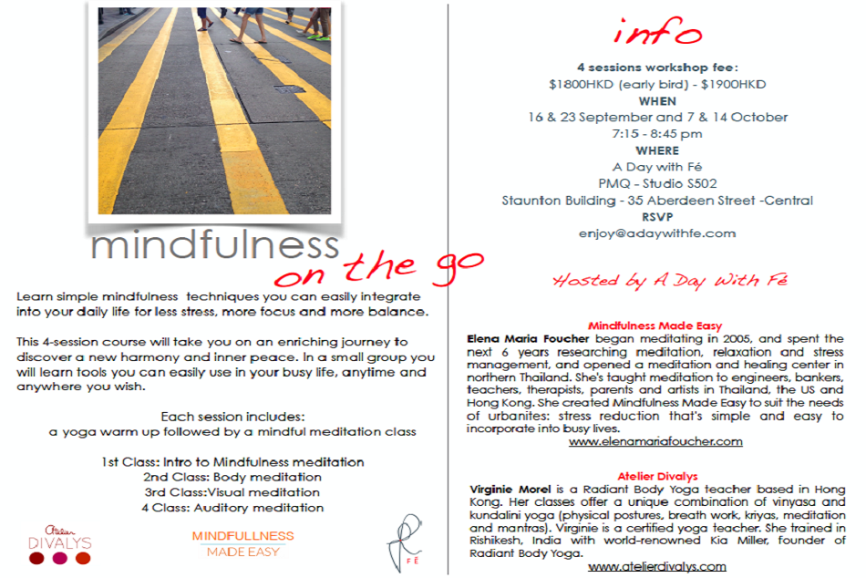 Elena Maria Foucher began meditating in 2005, and spent the next 6 years researching mediation, relaxation and stress management, and opened a meditation and healing center in northern Thailand. She’s taught meditation to engineers, bankers, teachers, therapists, parents and artists in Thailand, the US and Hong Kong. She created Mindfulness Made Easy to suit the needs of urbanites: stres reduction that’s simple and easy to incorporate into busy lives.