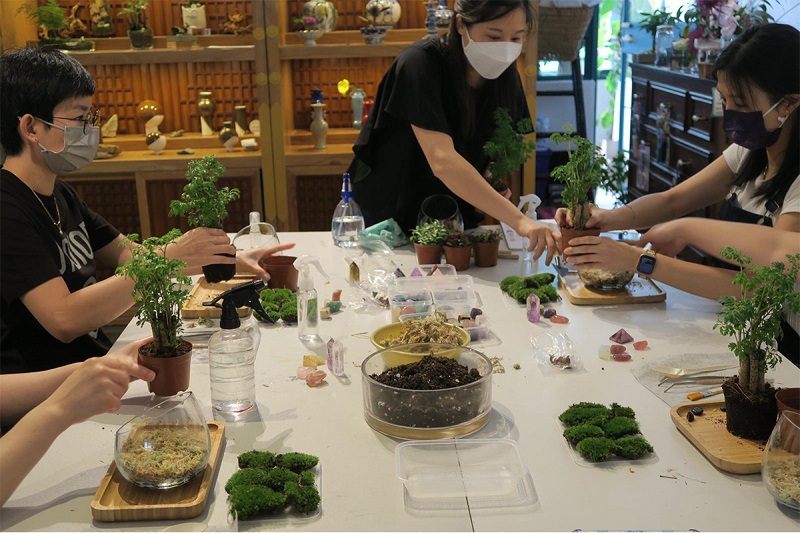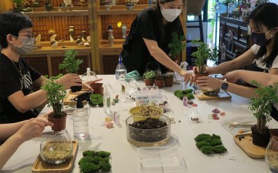 我们会教授製作盘景技巧及护养秘技,工作坊材料包括一棵室内植物,苔藓,动物摆设一隻及水晶原石。