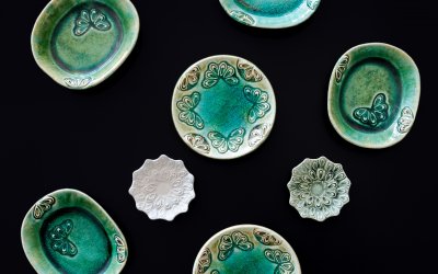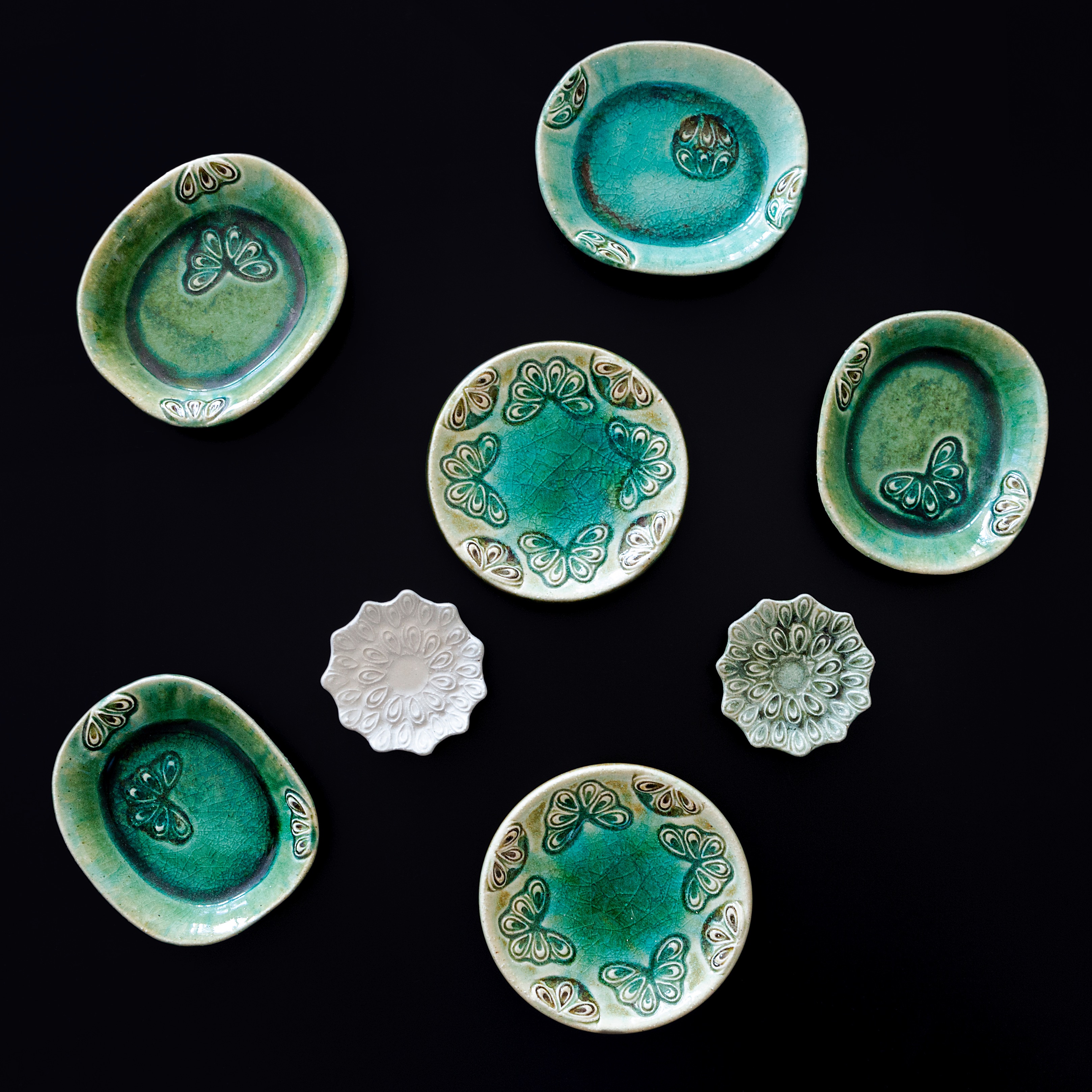 Kawasaki is relatively new to the Waka collection but her beautifully intricate style captured our attention from the moment we saw it. She uses a variety of glazes to bring out the carefully stamped patterns that make her work incredibly distinctive. Each piece is absolutely unique and individual according to the way the glaze sits and reacts with the heat from the kiln and so we hope you will be able to find a piece that speaks to you!