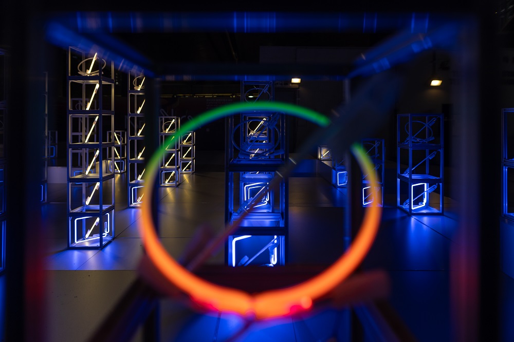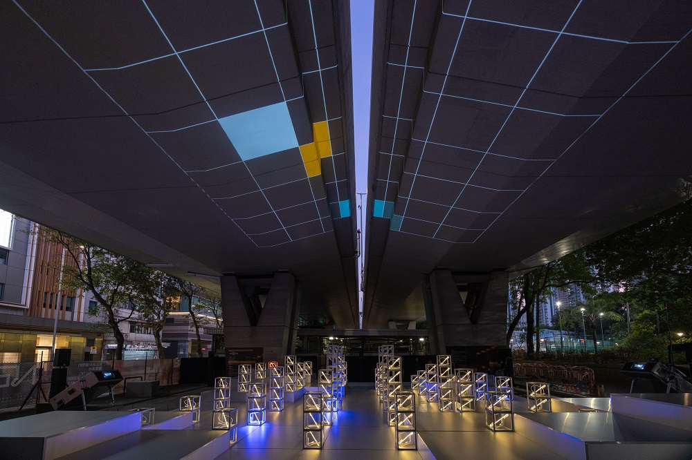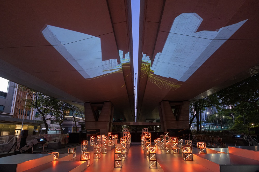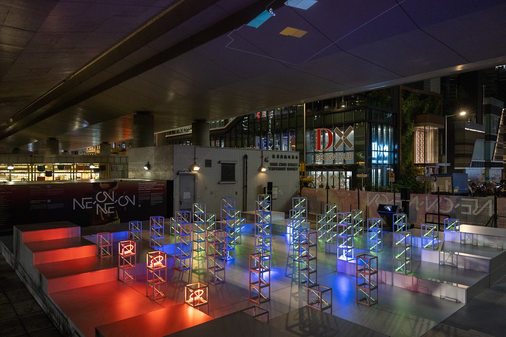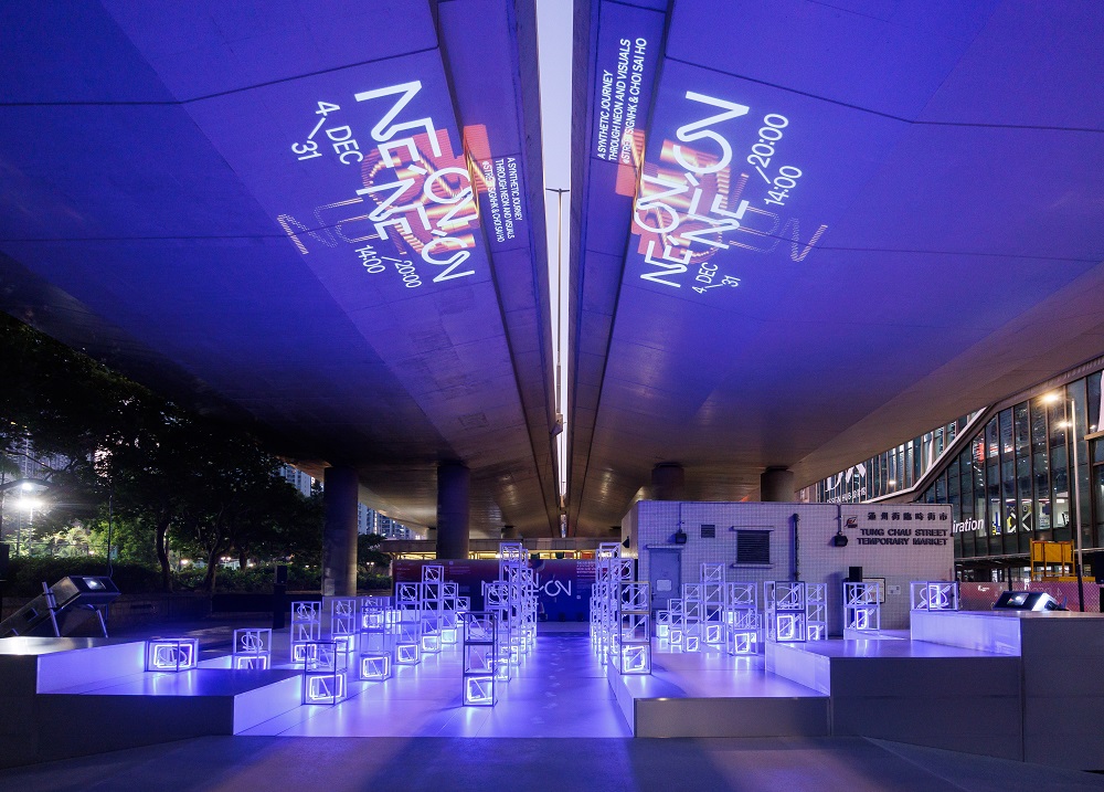 Inspired by the unique site conditions, @streetsignhk remains committed to preserving the cultural and historical value of neon within urban environments. The team expanded the modular neon system into programmable neon pillars arranged in a large-scale 3-dimensional display with multiple grids across a stepped stage. Fascinated by the dynamic interplay between unique visuals of Hong Kong’s urban landscape and captivating beats in Choi Sai-ho’s works, @streetsignhk invited the multimedia artist to engage in a creative dialogue with their programmable neon light system by utilizing the flyover’s soffit as a projection screen and integrating stage lighting controls, Ne-on-Ne-on becomes a dynamic multimedia platform for neon art to showcase its aesthetics, cultural significance, and emotional connection to the people of the city.