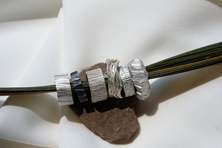这一系列的戒指阔别了设计师 Belinda Chang 一贯细腻精巧的小巧思。相对的探索了对表面处理以及各种手感与重量的探讨,继而成就了这一系列豪迈的戒指款式。用上925纯银并让局部发黑强调了表面质感。