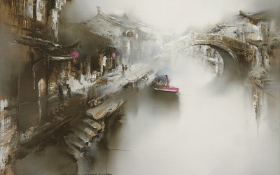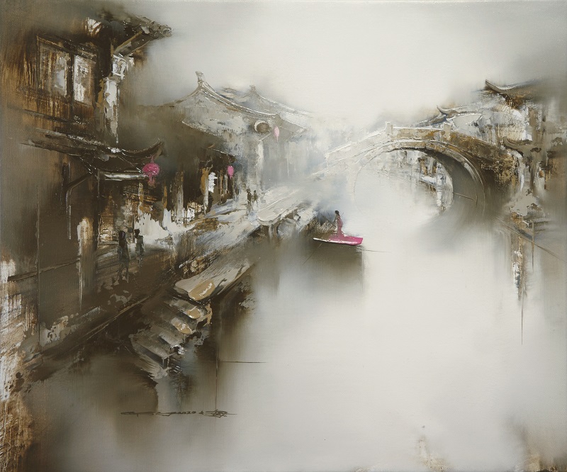 In the creation of Shanghai artist Gao Xiaoyun, the Jiangnan water town can be regarded as a cultural symbol. The faint rain, misty bridge, flowing water, and the floating boat, all interpret in a moving way the truest Jiangnan Spirit. Beyond a realistic scenery, Gao Xiaoyun portrays water town in a poetic and dreamlike way, giving the viewers infinite imagination space with a glimpse of clear and translucent colours. In his ingenious creation the memory and reality overlap with each other, softly enveloping a dreamlike poetry. With the exquisitely blurred boundary of time and space, the charm of ancient oriental art “there is painting in poetry, and there is poetry in painting” shines in his hands.