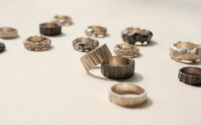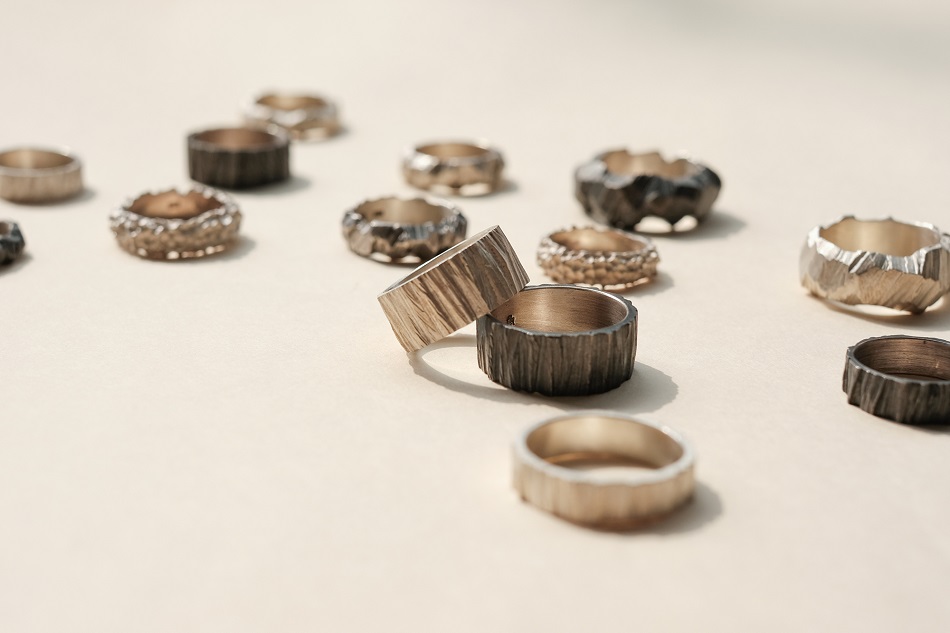 這一系列的戒指闊別了設計師 Belinda Chang 一貫細膩精巧的小巧思。相對的探索了對表面處理以及各種手感與重量的探討,嶙峋的外觀展現著天然岩石獨一無二的美態;不論是氧化發黑抑或皎潔銀白亦各有特色繼而成就了這一系列豪邁的戒指款式。