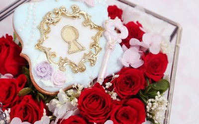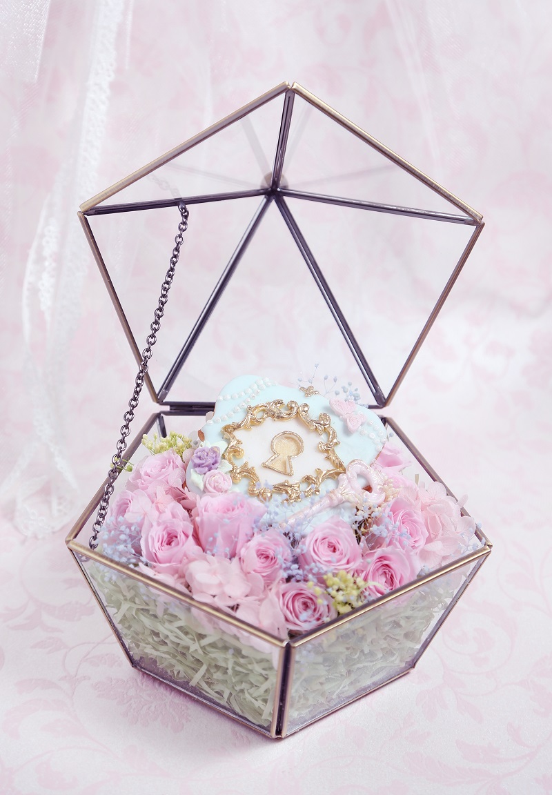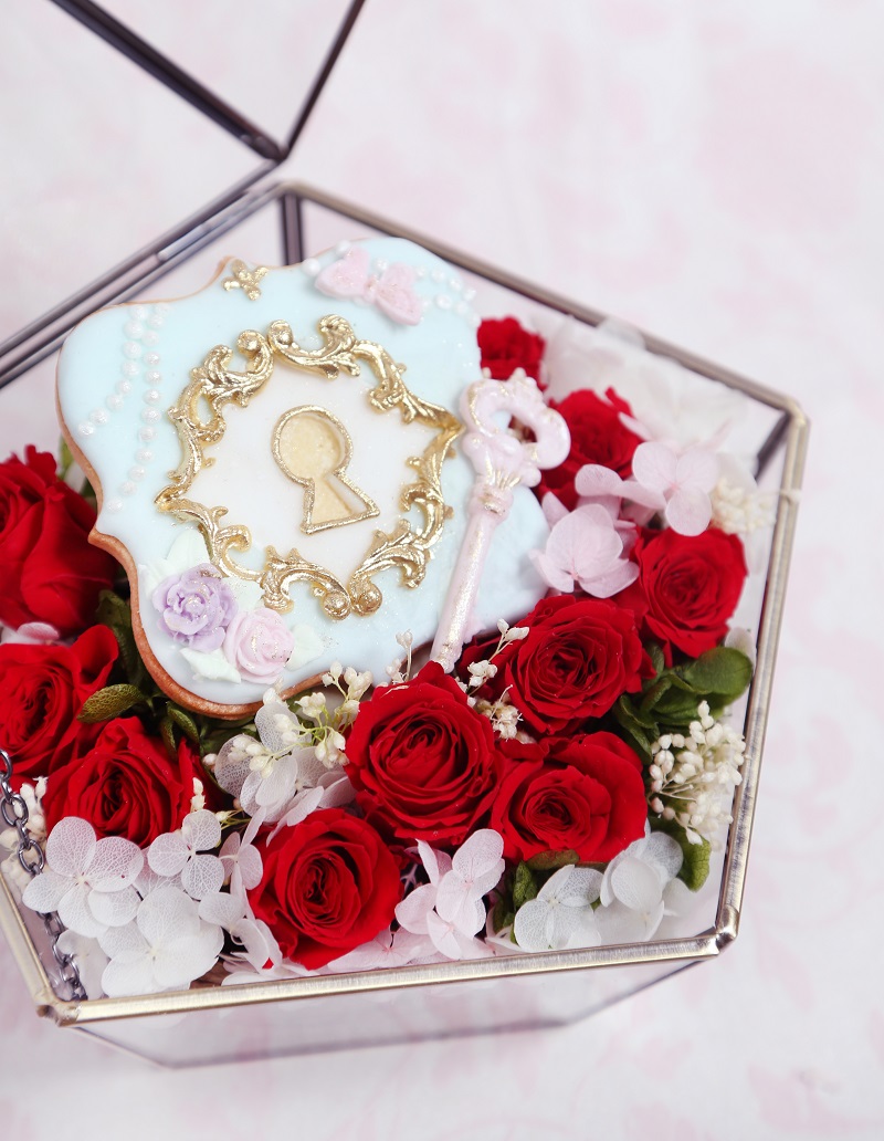 高貴典雅的手造曲奇,配上日本保鮮花,精美的玻璃盒子,是一份值得珍藏的心意,保鮮花經過特別處理,可以永久保存哦。