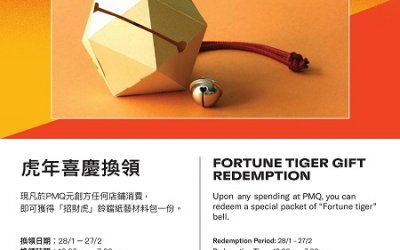 同場於PMQ元創方任何店舖消費,即可獲得招財虎鈴鐺材料包一份。趁著正月新禧,一同來扮演人見人愛吉祥物,招來福虎活力,好運連連!