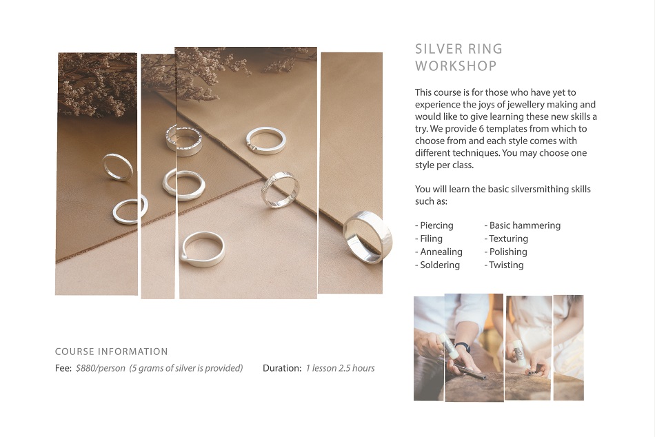 我們會提供一些簡單而獨特的介指款式以作參考,導師們會以小組或個人形式教授及協助你們完成屬於你的銀介指。制作班內可以學到一些金屬處理的基本技巧,如金屬切割,退火,焊接,挫修,打磨,手工抛光,金屬處理等。
