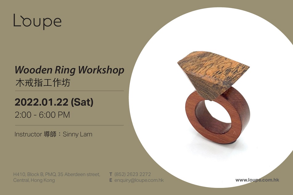 工作坊教授当代珠宝制作和怎样于传统设计中运用新材料。导师会介绍各种运用于珠宝制作里的木材和选择 最佳木材的方法。参加者将会学习怎样切割及塑形木材,然后组装成为美丽和独特的戒指,最后会运用蜂蜡 和沙纸去完成整个珠宝制作的过程。