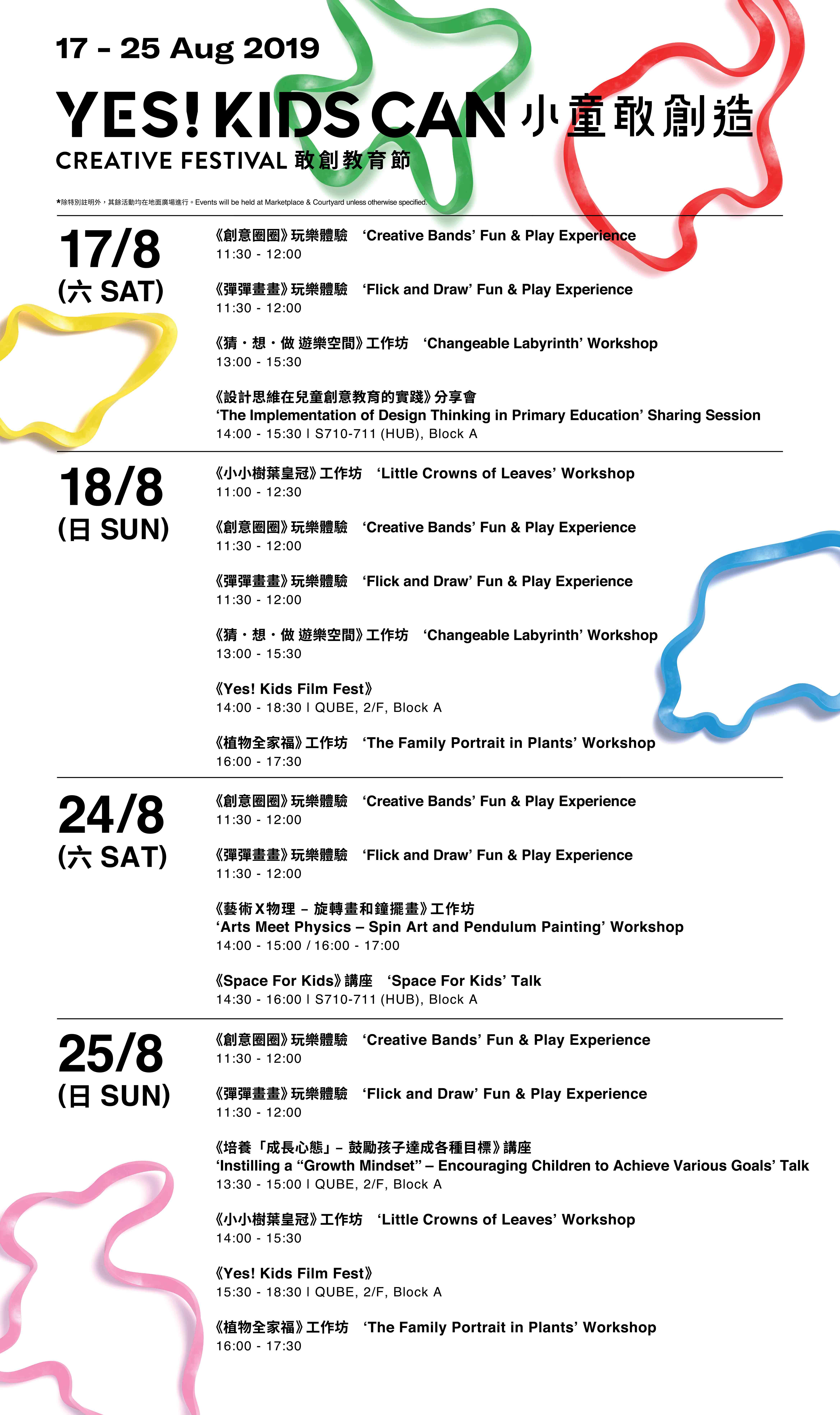 “YES! KIDS CAN Creative Festival” will be held from August 17 to 25. Teachers, educators, parents and children of age 3 to 12 are welcome to take part! Visit our exhibition to see students’ works and their creative process, and join our education related sharing sessions, movie screenings and creative workshops.