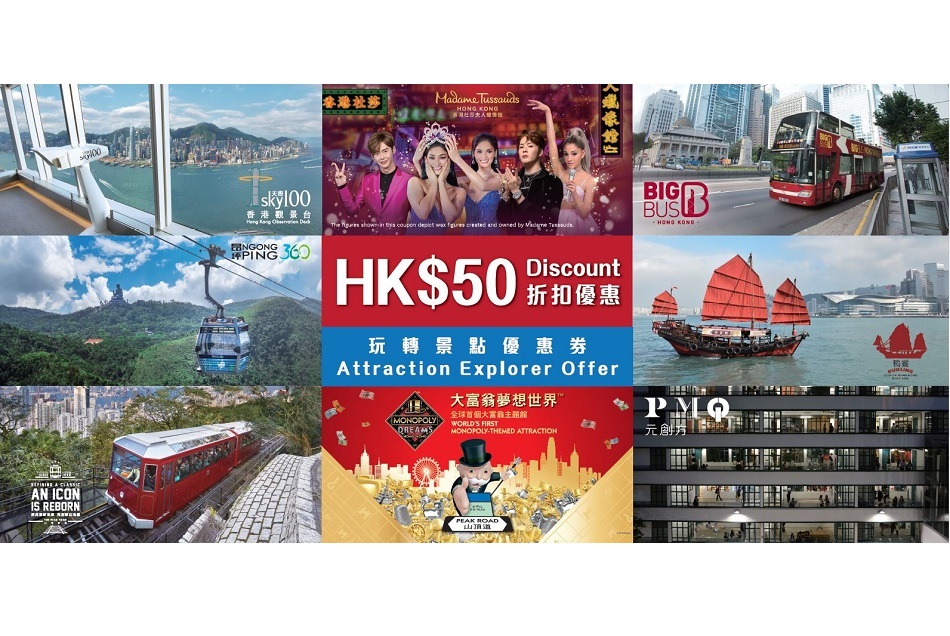 Big Bus Tours, Dukling, Madame Tussauds Hong Kong, Monopoly Dreams, Ngong Ping 360, the Peak Tram, PMQ and sky100 Hong Kong Observation Deck.