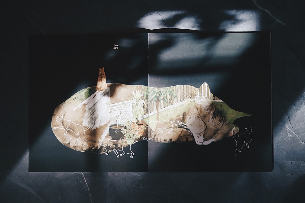 封面剪裁同时藏了巧思,打开暗藏的折页,瞥见猫影;「这就像运用电影镜头,有近镜及远镜。」封面是一个镜头,用剪接带读者进入故事。