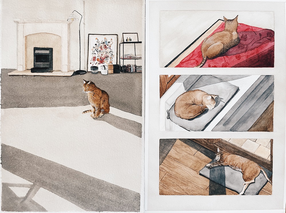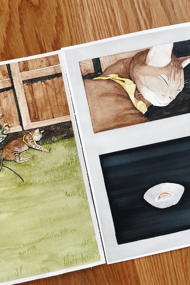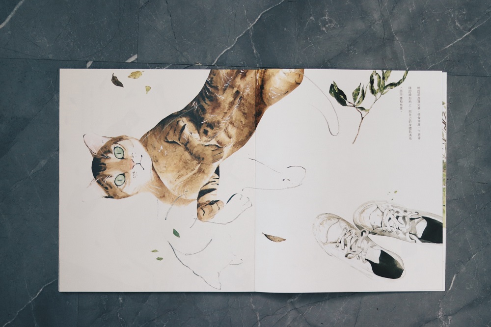 展品是十数幅水彩画,加上一本全手工制作的绘本书,主角是一头叫「老虎」的猫,作者是设计师Keith,而老虎是他家中的猫,一同生活接近十年。