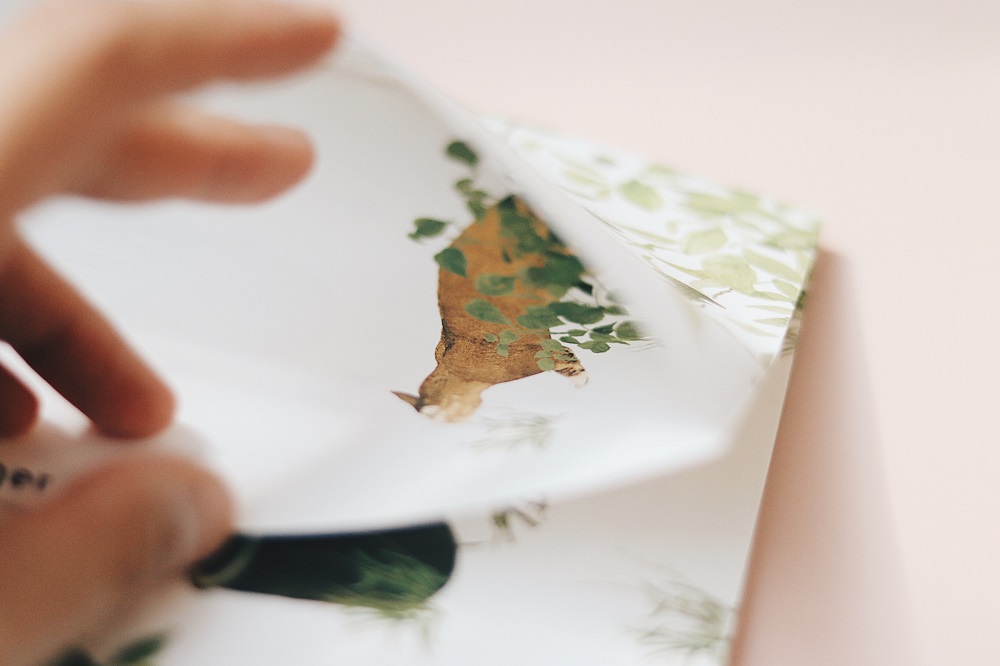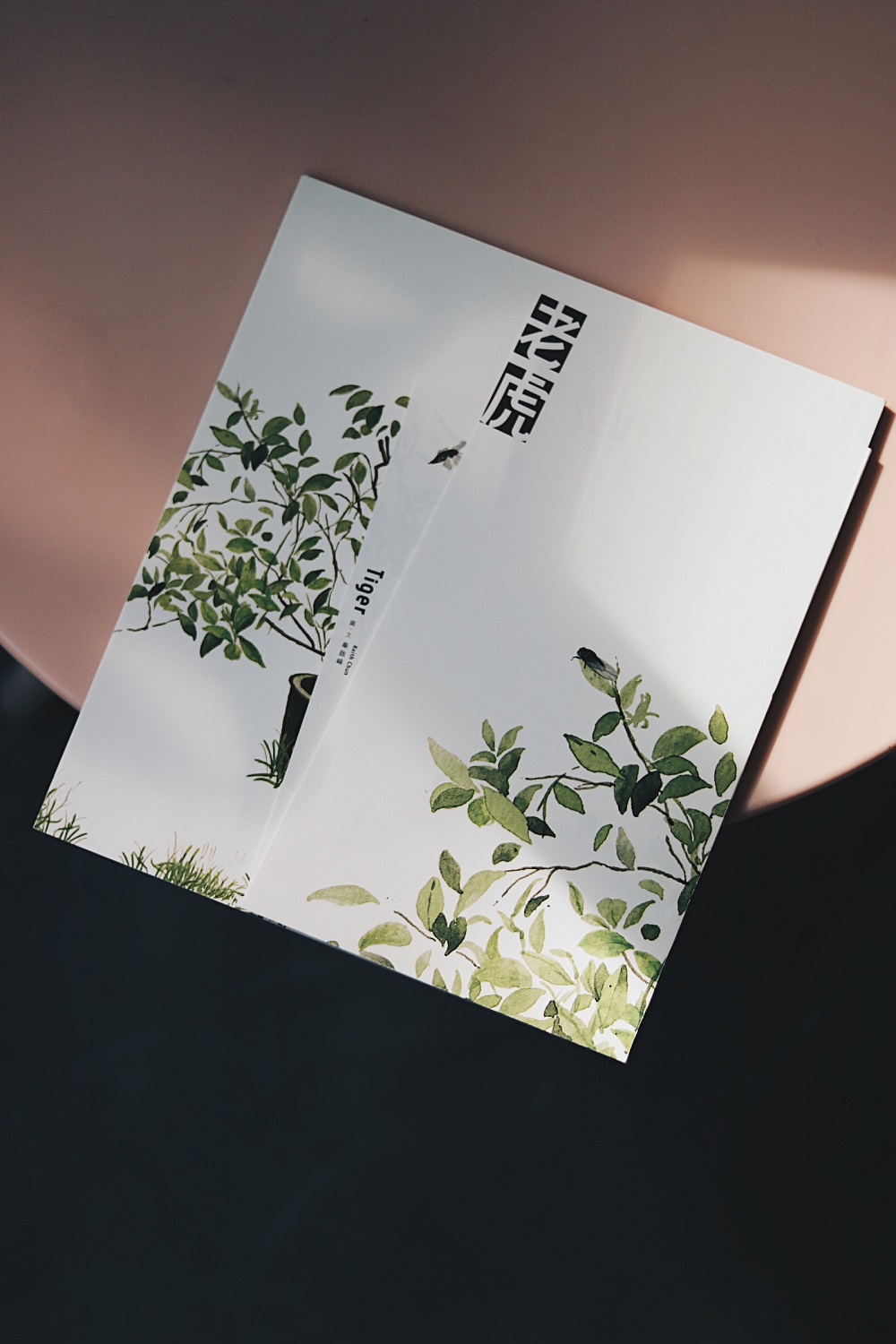 有别一般绘本,《老虎》拒绝选用精装硬皮封面,以保持整个印刷本的柔软度;封面见不到猫,只有散落的植物叶片,意味老虎正在流浪,于村子的丛林间游走。