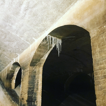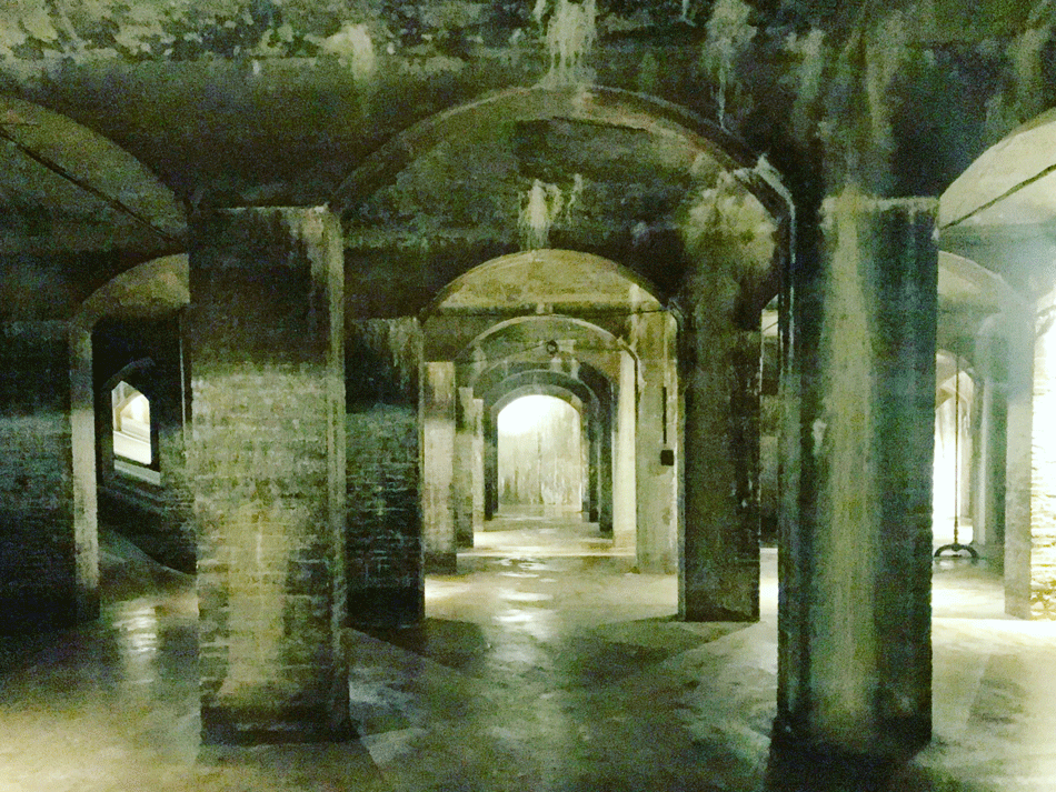 In the summer of 2018, I witnessed the power of The Cisterns in person, through the extraordinary exhibition by Danish artist Jeppe Hein titled IN IS THE ONLY WAY OUT. It was a bizarre, exciting and senses-stimulating experience: walking from the park above ground into the reservoir underground, transiting from bright to dim, caused my eyes, ears, nose, and even my pores on my skin to completely open all at once with heightened vigilance. There were water ditches everywhere on the ground, and the air is frigid, the almost a dead silent environment surrounded by grayish-white stone pillars.