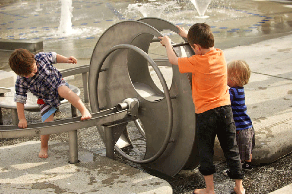 ASPECT Studios, which was responsible for the Darling Quarter redevelopment project, made use of the historical materials of the area. A hundred years ago, it was once a European settlement with rivers, mountains, steel casting factories, and steam flour mills. It is now transformed into a playground with elements like cement stone piers, sand piling squares, industrial pipes, and waterwheels, creating Australia’s first public playground where you can play with water. Australians also understand that children need some space to settle in and think. Therefore, mini-rivers, plants, and butterfly gardens are added among the series of play facilities.