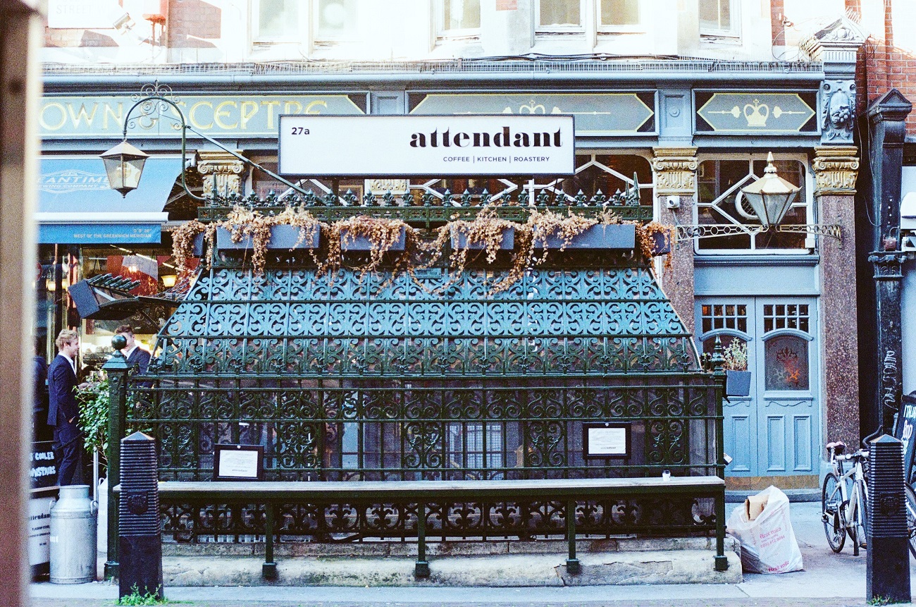 昔日英國公廁都有工人當值,並設有小小的辦公室,門外寫著Attendant(當值員);這空間改造成廚房,門木同時保留,Attendant亦乾脆取用為咖啡店名字——公廁還沒完成任務,繼續當值,只不過換上新的衣裳,為大眾提供另一種服務。
