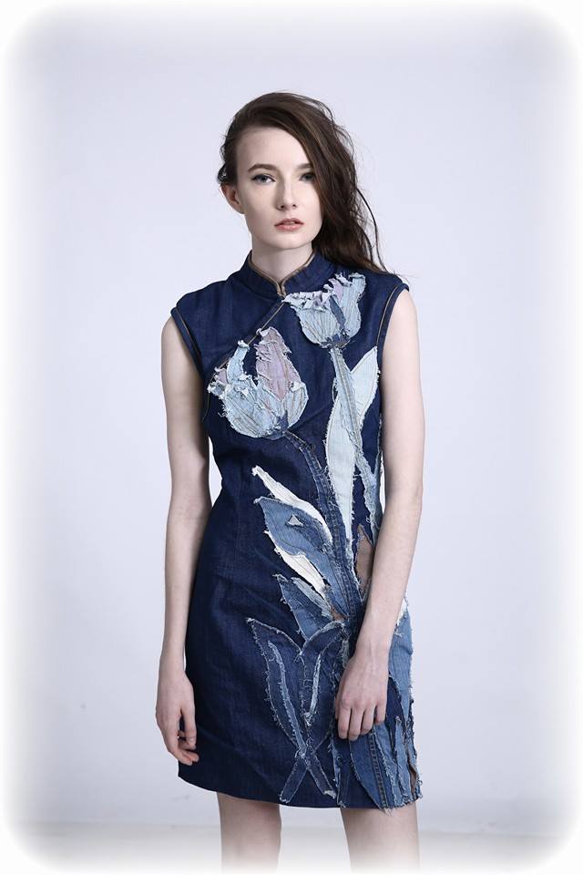 那是2011年的一次無心插柳。當時她參加設計比賽,以環保為題,把一批牛仔布料回收,找師傅裁縫上速成班,製作成旗袍。